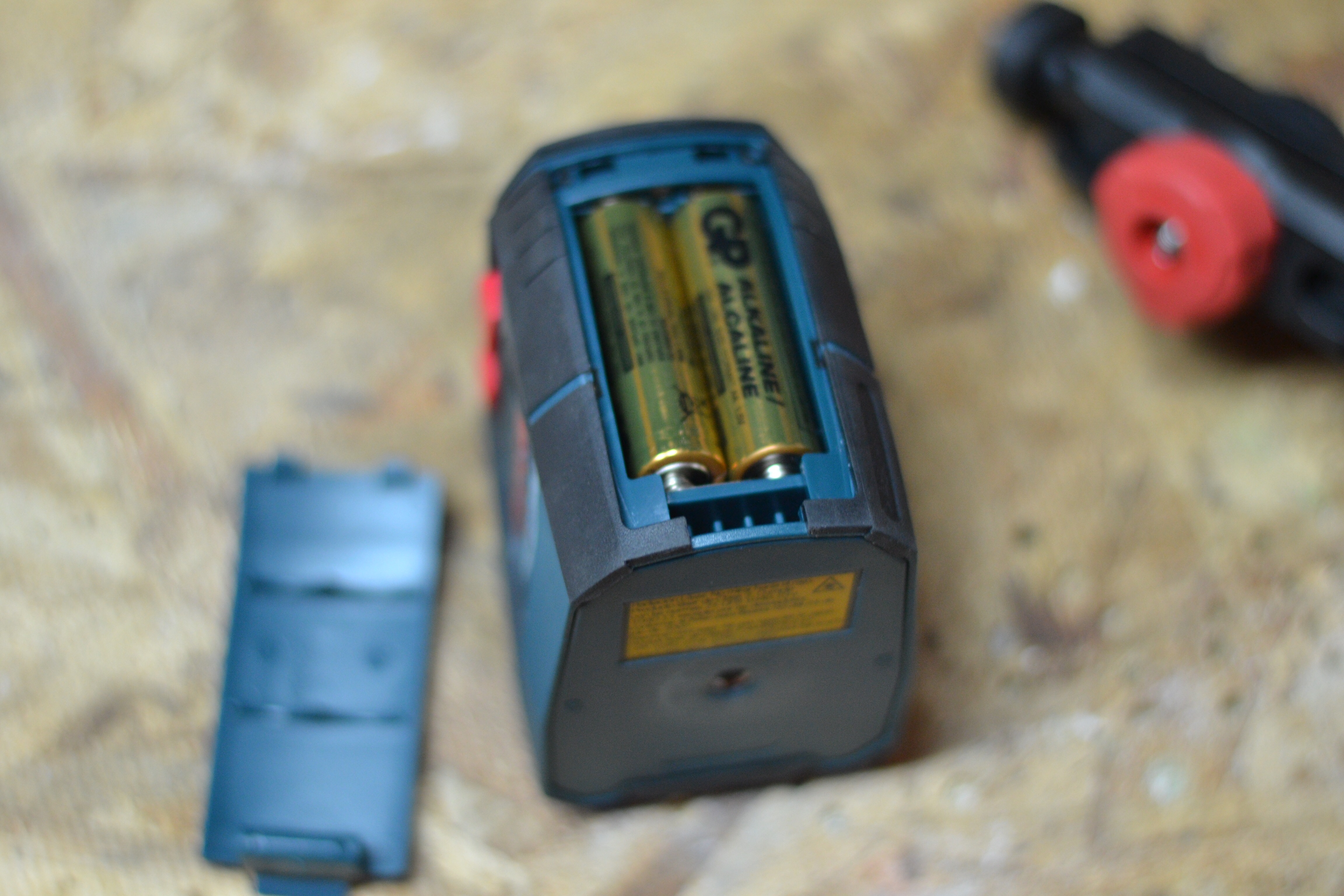I really like the size of this laser level, you can keep it in your pouch or bag without loosing much room. It runs on 2 AA batteries that are included in the package.